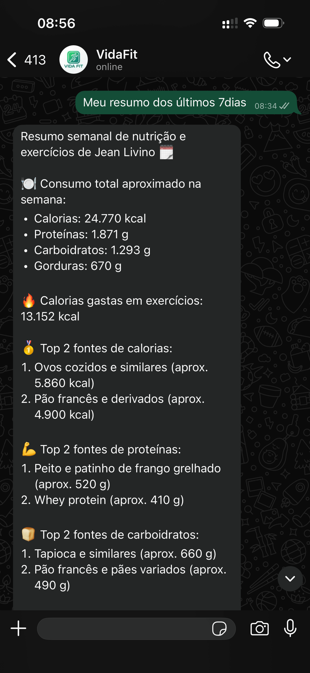Assistente de saúde pelo WhatsApp para registrar refeições, treinos e evolução corporal de forma simples, prática e sem planilhas. Mais constância, mais resultado.